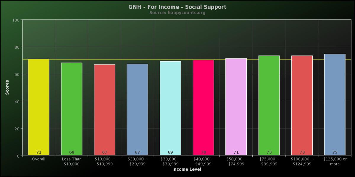 The Gross National Happiness score for the domain of community - connection to friends and family, volunteerism and trust in others - indicates income does not make that much of a difference. These results are from over 25,500 people who took the survey between March 2011 and September 2013.