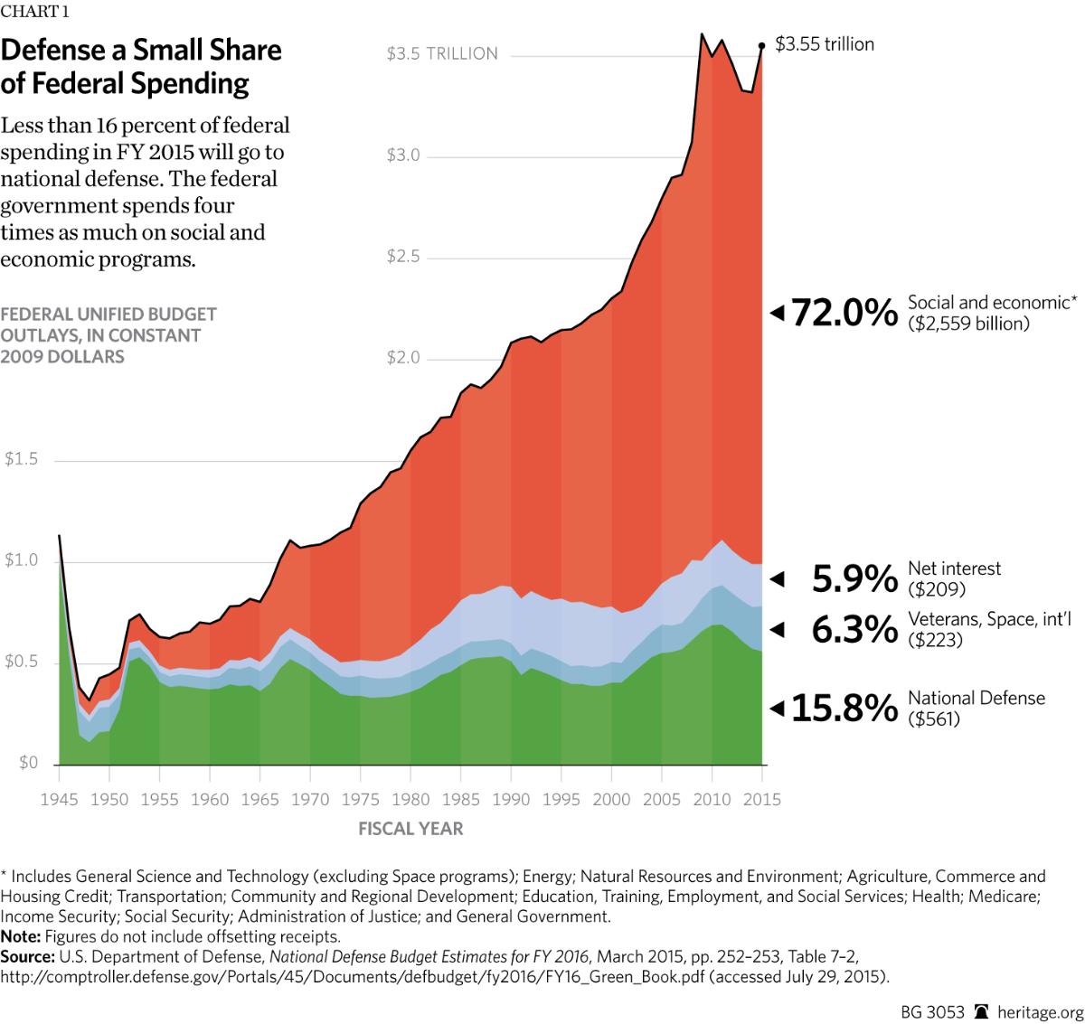 The federal government spends four times as much on social and economic programs as it does on national defense.