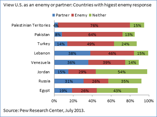 When asked by Pew if the US is a partner to their country or an enemy, clear majorities in 23 nations say it’s a partner. The "enemy" response was particularly high in the Palestinian Territories (76 percent), Pakistan (64 percent), Turkey (49 percent), Lebanon (46 percent), and Venezuela (39 percent), and Jordan (29 percent).
