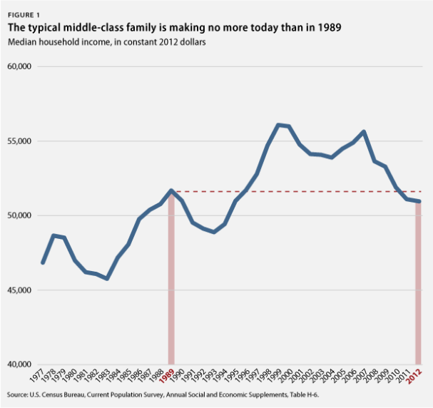 New U.S. Census data reveals that after adjusting for inflation, the typical middle-class American family is making less than it was in 1989. Since the Lehman collapse in 2008 and subsequent financial crisis, middle-class households have lost all the gains made after the 2001-2003 recession, and have even seen the undoing of all income gains made in the 1990s boom.
