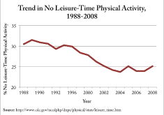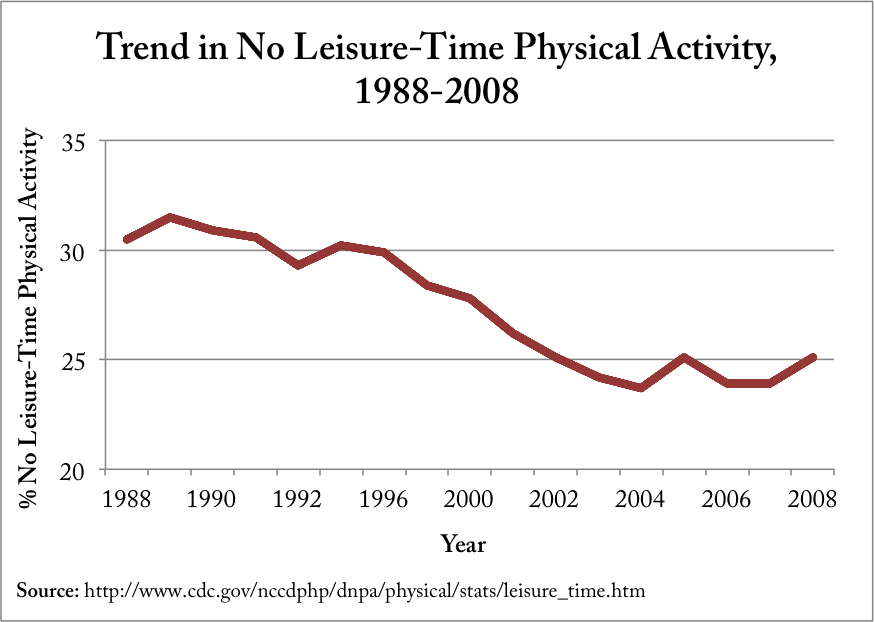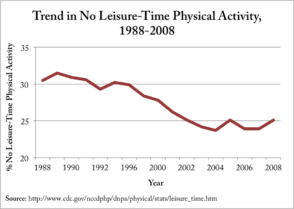 Based upon the reports from 36 participating states and the District of Columbia, the number of the U.S. population that reported no leisure-time physical activity has ultimately decreased from about 31% in 1989 to about 25% in 2008.