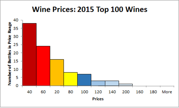 I've had a question lately: is the price of a bottle of wine correlated to its ranking? You've heard yes, you've heard no. I took data from Wine Spectator's Top 100 Wines of 2015 and created a histogram. The result? Well, you can get 16% of the wines on the lest for under $20. But be prepared to shuck $30-$40 for the bulk of the bottles.