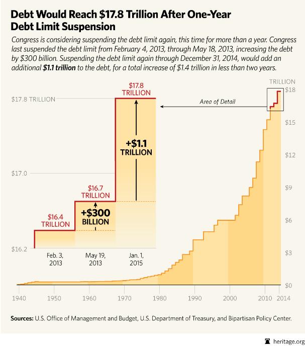 Congress is considering suspending the debt limit again, this time for more than a year. Congress last suspended the debt limit from February 4 through May 18, increasing the debt by $300 billion. Suspending the debt limit again through December 31, 2014, would add $1.1 trillion to the debt, for a total increase of $1.4 trillion in two years.