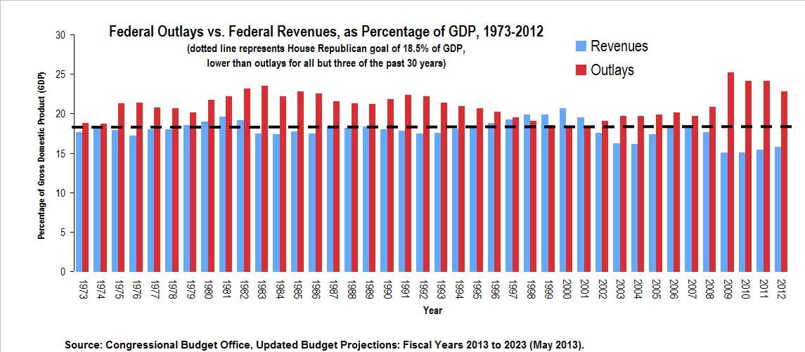 Federal Outlays vs. Federal Revenues, as a Percentage of GDP, 1973-2012
