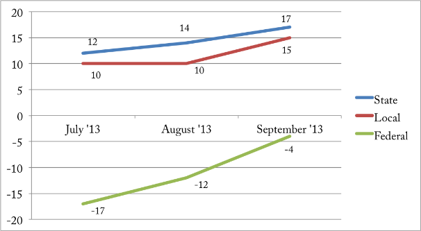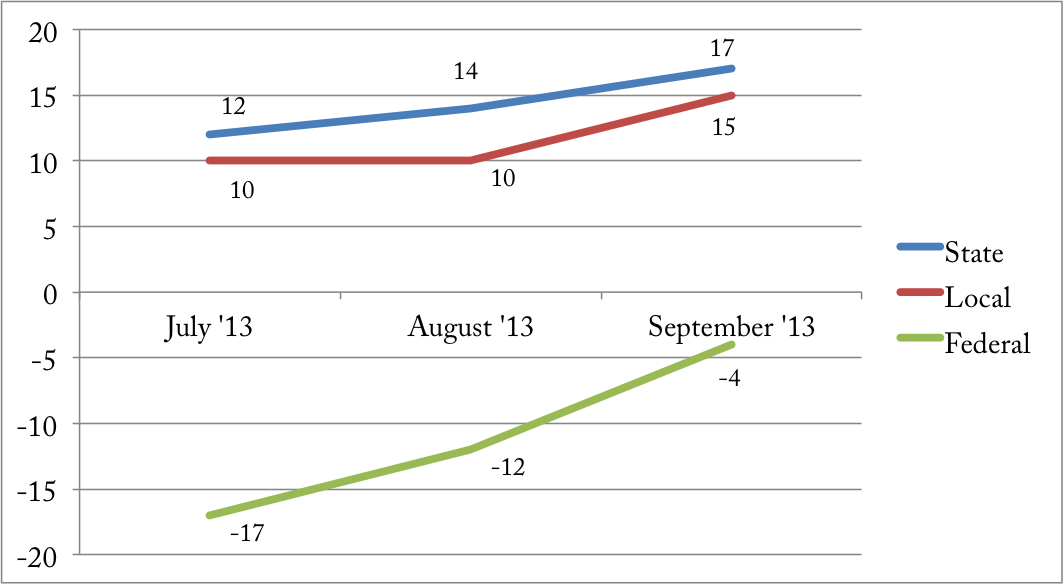A new detriment of the shutdown: it halted and may have possibly ended the trend of increasing government job creation. Information about the data: "Gallup's Job Creation Index represents employee perceptions of 'net hiring' at their workplaces, defined as the percentage saying their employer is hiring minus the percentage saying their employer is letting workers go."