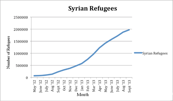 Every day, an average of 5,000 Syrians flee the country. The majority of refugees have been registered in Lebanon, Jordan, Turkey, Iraq and Egypt. The number is likely to exceed 5 million by 2015. A further 4.25 million are currently displaced within the country.
