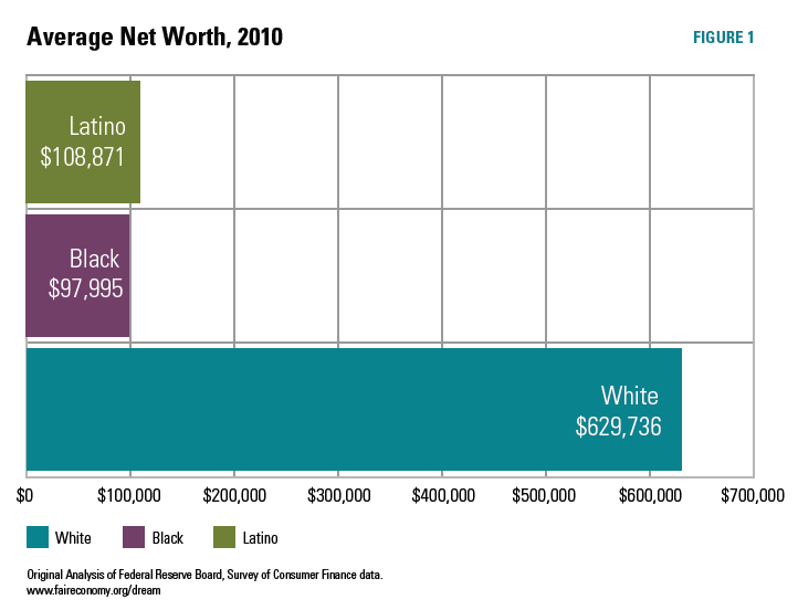 The basic racial and ethnic disparities in wealth (or net worth: total assets minus total debt) are immense. In 2010 – the most recent year for which data is available – White families held on average more than six times as much net wealth as Black families and nearly six times as much as Latino families.