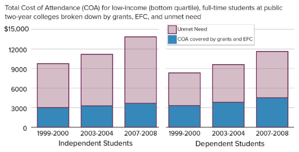 The unmet need, or the gap between college costs and what students can afford to pay on their own, is increasing quickly -- especially for the lowest-income families. In 2009, 58% of students who left school without a degree or certificate received no financial help from their parents or other relatives, and 69% did not receive scholarships or financial aid.