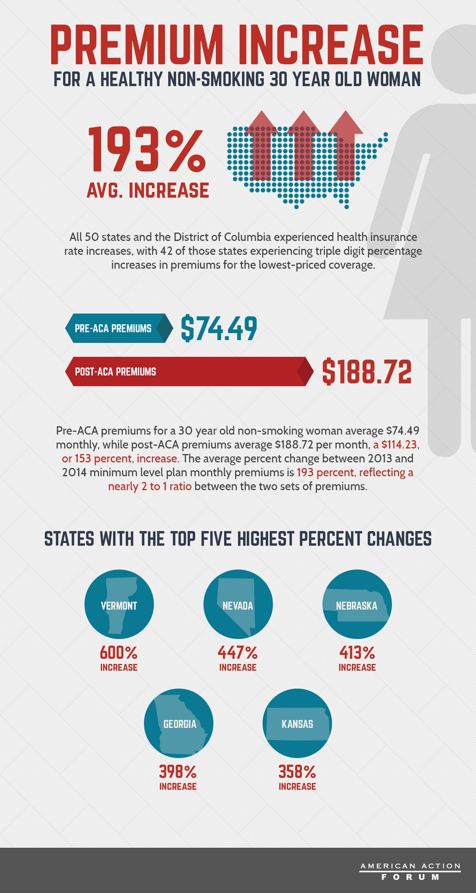 Pre-Affordable Care Act premiums for a 30 year old non-smoking woman average $74.49 monthly, while post-ACA premiums average $188.72 per month, a $114.23 or 153% increase. The average percent change between 2013 and 2014 minimum level plan monthly premiums is 193 percent, reflecting a nearly 2 to 1 ratio between the two sets of premiums.