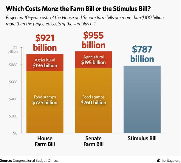 Projected 10–year costs of the House and Senate farm bills are more than $100 billion more than the projected costs of the stimulus bill.