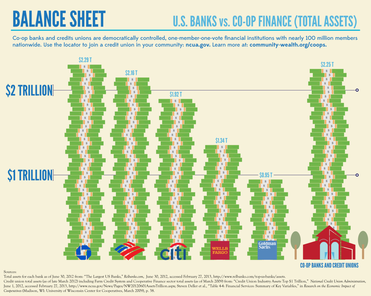 In 2012, credit unions passed an important milestone: collectively, these cooperatively owned, one-member-one-vote financial institutions hold more than $1 trillion in assets. Taken together, they would equal the fifth largest U.S. bank, knocking Goldman Sachs out of the top five (this doesn't include other sectors of cooperative finance, which, if taken all together, would comprise one of the largest banks).