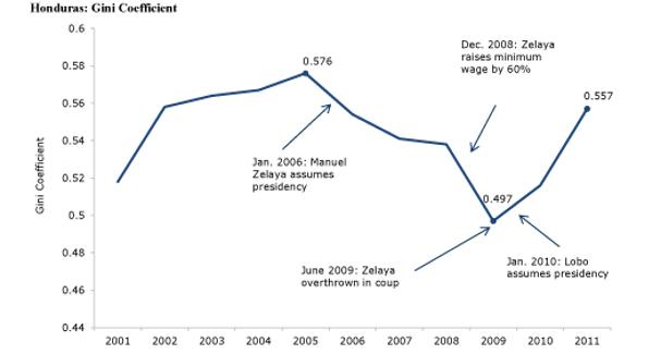 In the two years after the 2009 coup, Honduras had the most rapid rise in inequality in Latin America and now stands as the country with the most unequal distribution of income in the region. Over 100 percent of all real income gains in in 2010 and 2011 went to the wealthiest 10 percent of Hondurans.