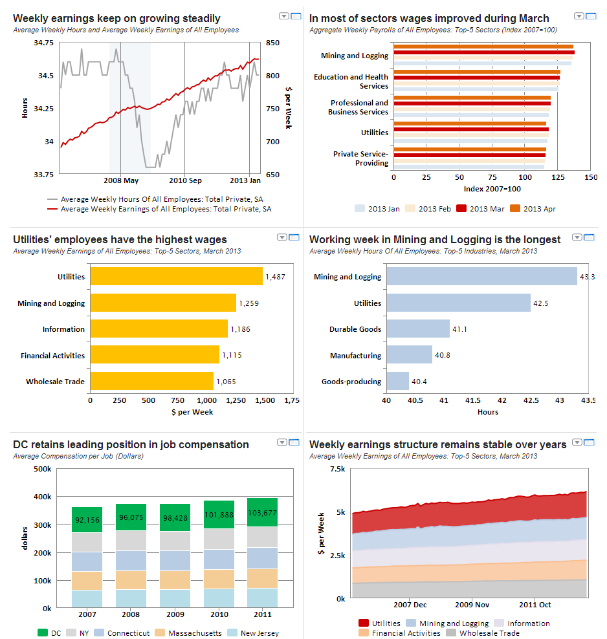 On the whole, labor compensation in the US retains stability over years. During the start of 2013 average earnings revealed moderate growth in major sectors. Utilities remains the sector with the highest weekly earnings levels, yet showing slight decrease in the March 2013. Concerning job compensation among states, District of Columbia is the most favorable one in these terms.