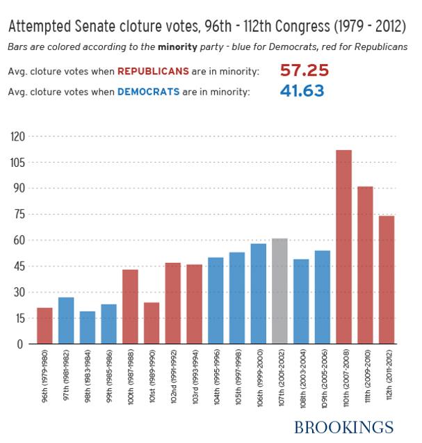 In their Vital Statistics on Congress report, Brookings Senior Fellow Thomas Mann and AEI Resident Scholar Norman Ornstein provide data on the number of attempted Senate cloture votes taken from 1979 to 2012, the 96th to 112th Congresses. The chart below demonstrates the average attempted cloture vote taken by party when that party was in the minority.