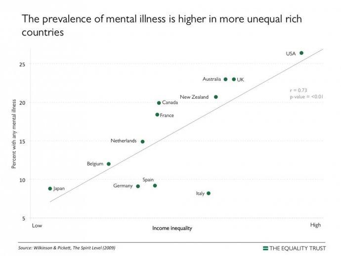 As the graph shows, mental illness is much more common in more unequal countries. Among these countries, mental illness is also more common in the richer ones.