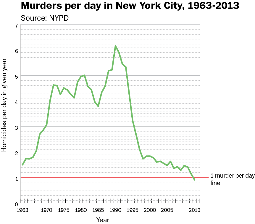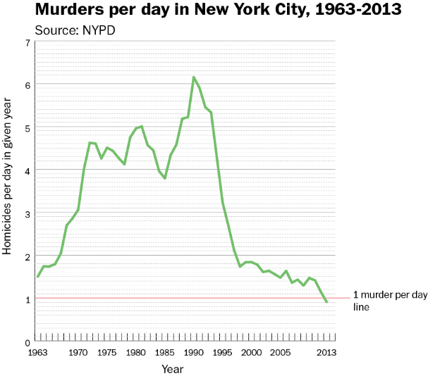 This data isn't quite complete, but given that New York City had only 332 homicides all year as of 12/30, it’s almost certainly going to end the year with an average rate of less than one murder per day. That's an all time low. If you want to Know More, click Read the Article above.
