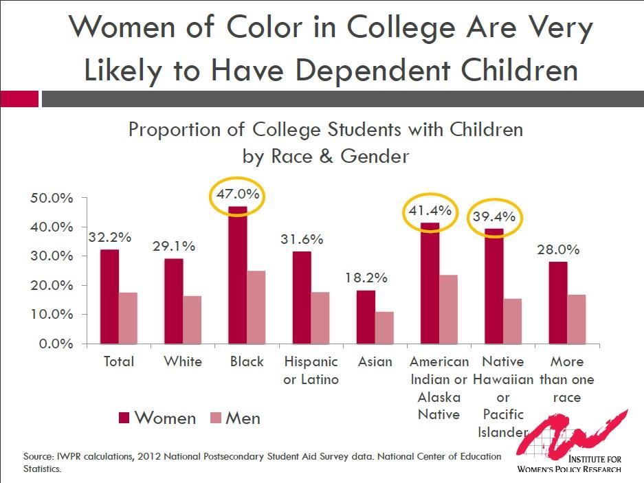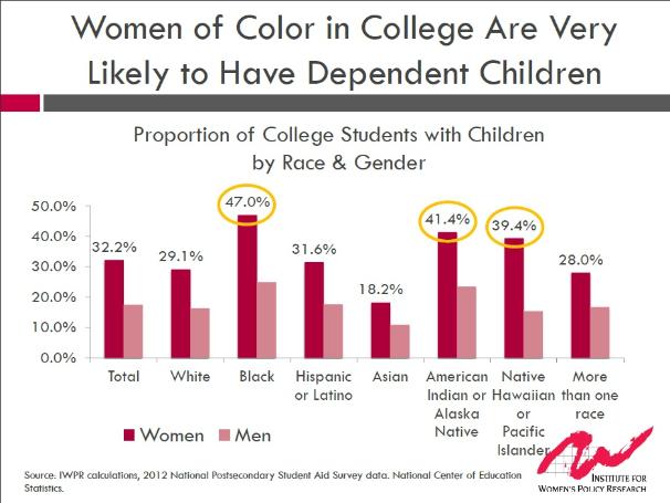 47% of black women who attend college have dependent children, yet campus child care centers only address 5% of the need and on-campus child care is declining.