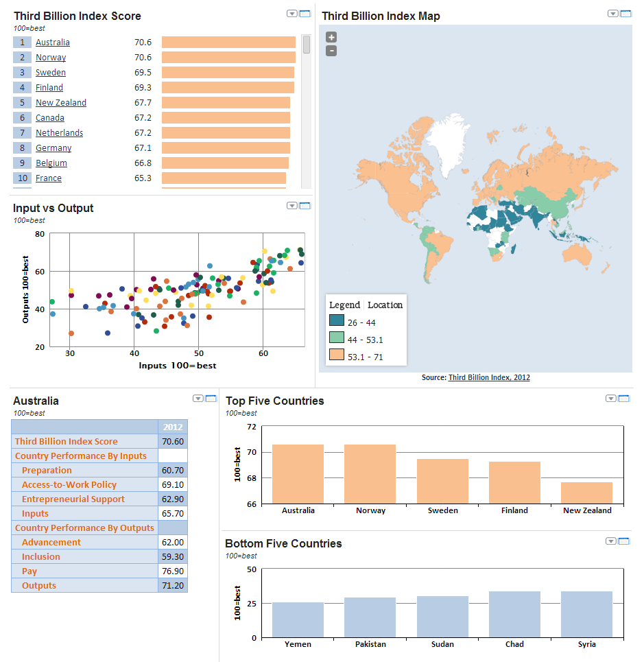 Booz & Company created the Third Billion Index, a ranking of 128 countries worldwide that is based on how effectively leaders empower women as economic agents in the marketplace. The index is a composite of established data on women’s economic and social status. The Third Billion Index is unique in that it focuses specifically on women's work in the world.