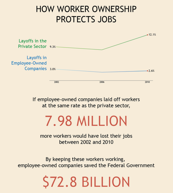Owning stock in her company through an Employee Stock Ownership Plan (ESOP), makes an employee part owner. Employee ownership retention is four times the rate for the overall population. If employee-owned companies laid off workers at the same rate as traditional firms, they would have laid off more than 2.28 million in 2010 (1.8 million more than they did).