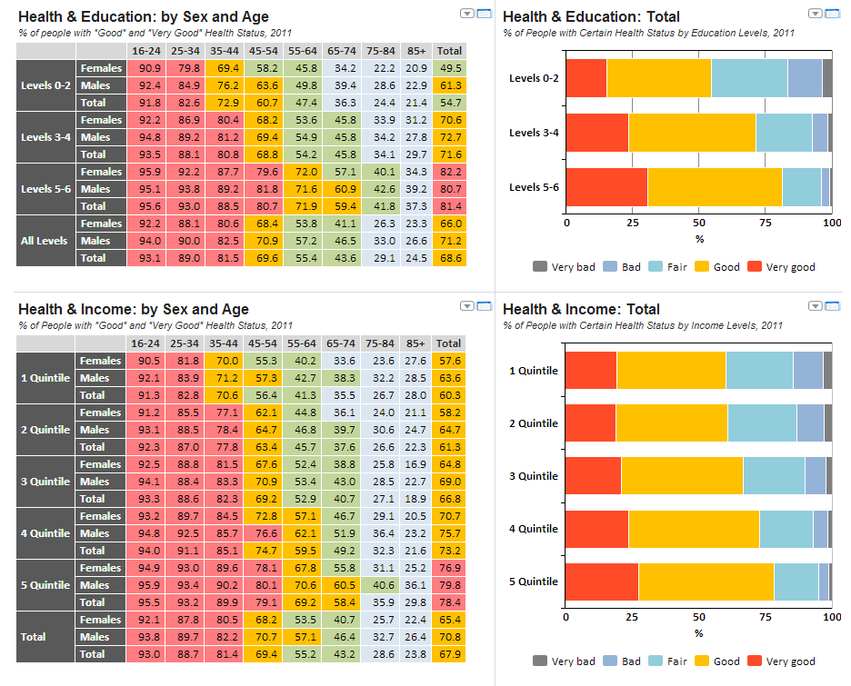 Only 55% of people with low education level perceive their health status as “good” and “very good”. At the same time 81% of population with high education level has good and very good health. The same is for income: the share of healthy people grows by almost 20% with the increase of income level from 1st to the 5th quintile.
