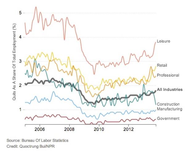 Recent data from the Bureau of Labor Statistics show that workers in a range of industries are quitting at a higher rate than in previous years. This may be further evidence that the labor market is improving: "People usually quit because they have another job, or are confident that they can get one."
