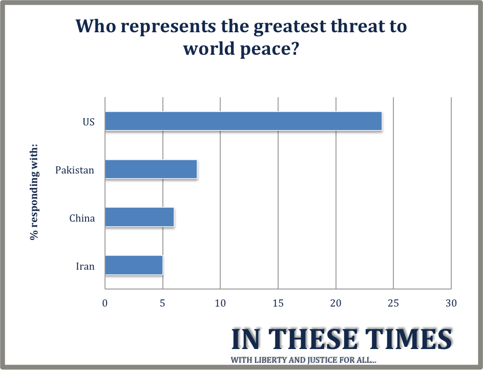 The results of a WIN/Gallup International Poll on the question of which nation presented the greatest threat to peace in the world produced overwhelming response in naming the US the world's biggest aggressor, far outpacing Pakistan and Iran. Jump to the article to read world-famous professor Noam Chomsky's take on the poll results.
