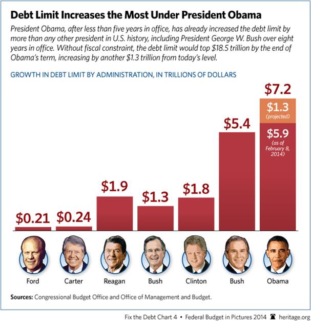 President Obama, after less than five years in office, has already increased the debt limit by more than any other president in U.S. history, including President George W. Bush over eight years in office. Without fiscal constraint, the debt limit would top $18.5 trillion by the end of Obama’s term, increasing by another $1.3 trillion from today’s level.
