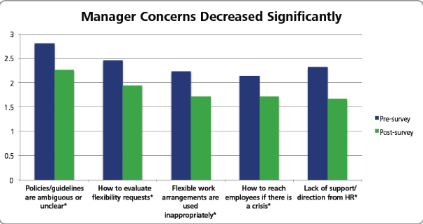 The National Workplace Flexibility Study provided training, support and coaching to managers on leading flexible teams. By participating in the study process and creating flexibility team blueprints, managers’ concerns decreased in several areas.