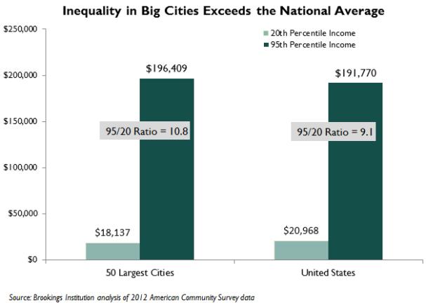 Across the 50 largest U.S. cities in 2012, the 95/20 ratio was 10.8, compared to 9.1 for the country as a whole. The higher level of inequality in big cities reflects that, compared to national averages, big-city rich households are somewhat richer ($196,000 versus $192,000), and big-city poor households are somewhat poorer ($18,100 versus $21,000).
