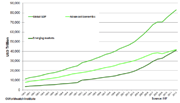 2012 saw a rough equalization of the GDPs between emerging market economies and those of the developed world. The financial crisis set the developed markets back more drastically in the late 2000s, allowing the booming emerging markets of the globe to pull level.