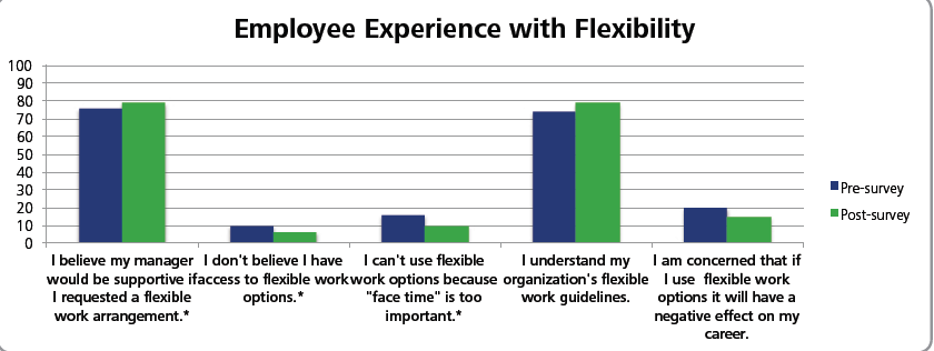 After the National Workplace Flexibility Study, employees felt more comfortable requesting flexibility although participating organizations’ policies didn’t change during the study, and employees did not participate directly in the study. The shift may have been due to increased manager awareness and comfort in dealing with flexibility, and involvement in flex team blueprints which encouraged managers to discuss flexibility with teams.