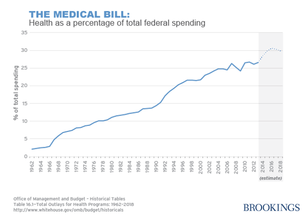 In 1962, before Medicare and Medicaid got going, overall health spending (Medicare, Medicaid, VA, government employees health insurance, etc.) amounted to 2% of all federal outlays. By 1992, it was up to 17%. This year, it will be around 28%. The White House last year projected it would top 30% in a couple of years.