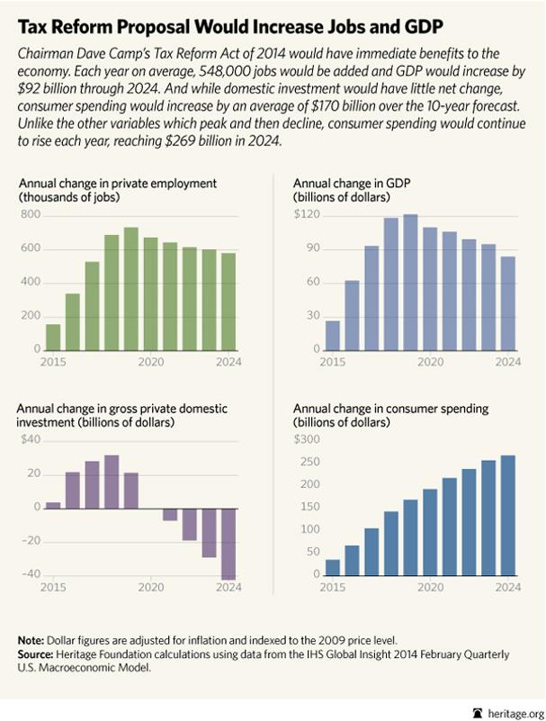 Chairman Dave Camp’s Tax Reform Act of 2014 would have immediate benefits to the economy. Each year on average, 548,000 jobs would be added and GDP would increase by $92 billion through 2024. And while domestic investment would have little net change, consumer spending would increase by an average of $170 billion over the 10-year forecast.
