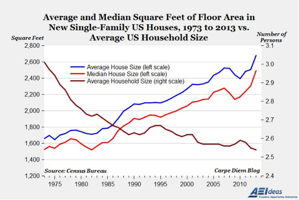 In 2013, the average size of new houses built increased to an all-time high of 2,679 square feet. Over the last 40 years, the average home size has increased by more than 1,000 square feet. Meanwhile, the average household size has been declining, from 3.01 persons per household in 1973 to a low of 2.54 persons per household last year.