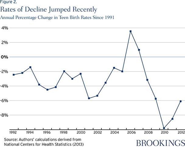 Teen births fell at a rate of 2.5 percent per year between 1991 and 2008; that rate tripled to 7.5 percent per year between 2008 and 2012.