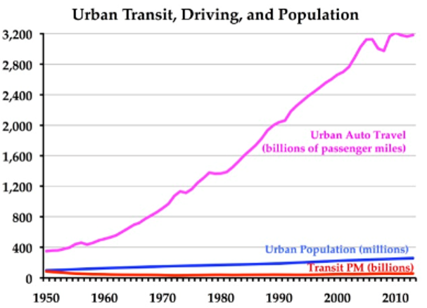 The American Public Transportation Association (APTA) wants people to believe that transit is an increasingly important form of transportation, citing a 0.7% increase in annual transit ridership in 2013 as proof. In fact, transit is increasingly irrelevant. Although urban driving experienced a downward blip after the 2008 crash, it's now rising while transit outside of New York City is declining.