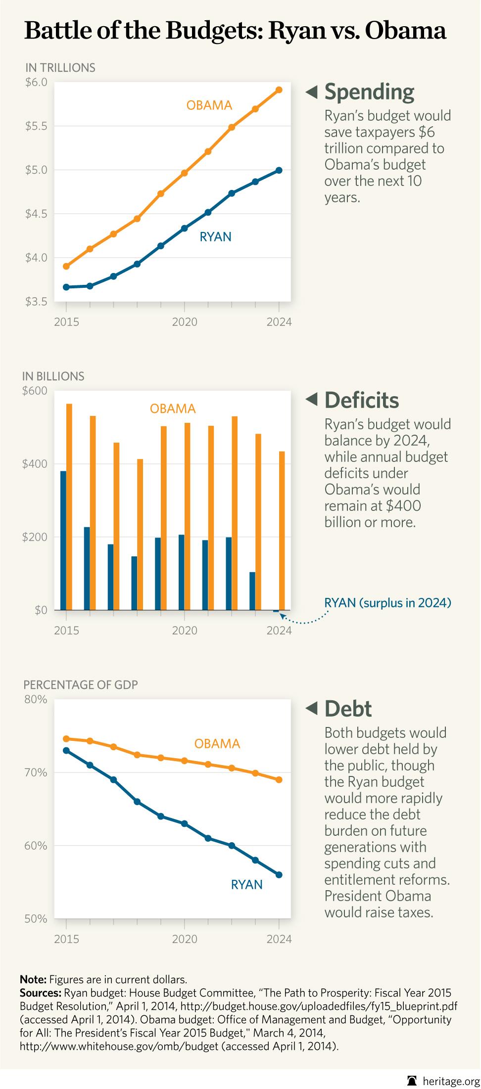 Rep. Paul Ryan’s budget for the next ten years presents a vastly different picture than President Obama’s. Ryan’s budget would save taxpayers nearly $6 trillion when compared to Obama’s budget, eliminate deficits by 2024, and more rapidly reduce debt held by the public.