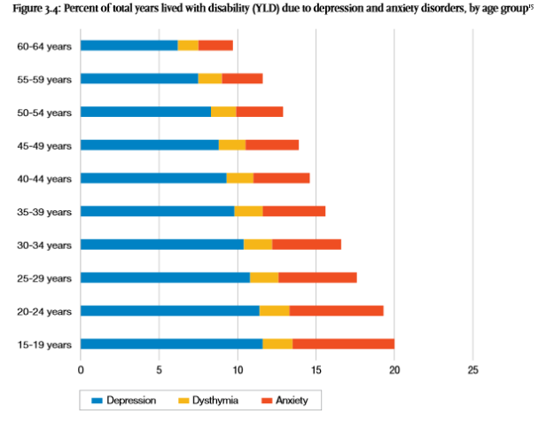 Across different regions of the world, depression and anxiety disorders alone account for 10-18% of all years lived with disability in those populations. The disability burden is highest in adolescence and young adulthood (20% among 15-19 year olds), falling steadily to 10% by the age of 60-64 years.