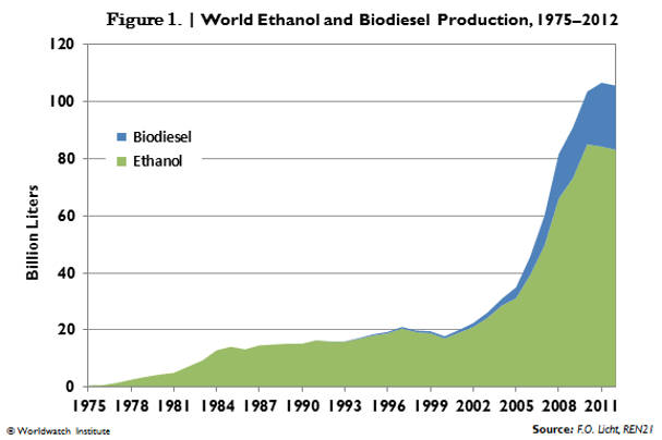In 2012, the combined global production of ethanol and biodiesel fell for the first time since 2000. Biofuels are a subset of bio-energy, which is energy derived from biomass (plant and animal matter). They can be used in liquid forms to replace or supplement the traditional fossil fuels, but only make up 0.8% of global energy use.