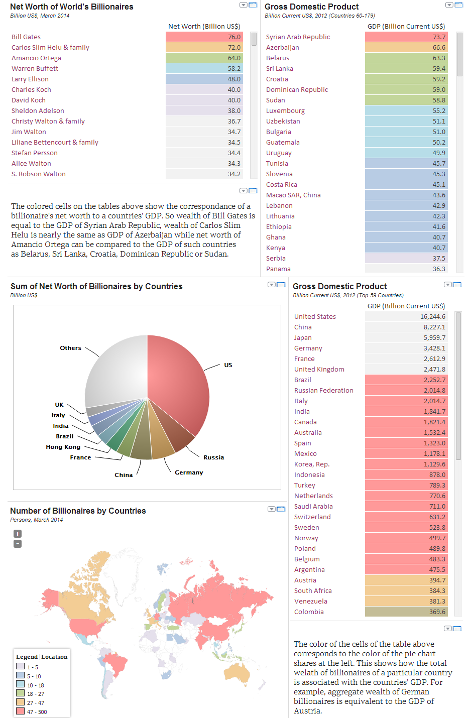 According to the Forbes, aggregate wealth of 1645 world's billionaires, which totals in $6.4 trillion as of March 2014, is bigger than Japanese GDP - third in the world's GDP ranking with the value of $6 trillion. So, wealth of 0.00002% of world's population account for 9% of the world's GDP ($72 trillion as of 2012).