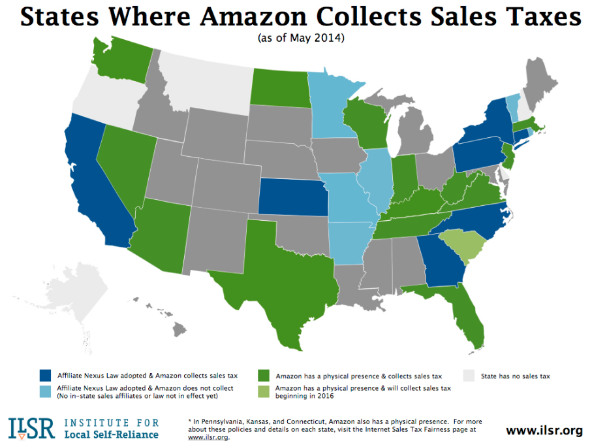 When online retailers don't have to collect sales tax it disadvantages local businesses, undermines state and local governments that use this revenue for schools, police, and other services, and disadvantages those without internet access or a credit card. The laws right now are complicated—just look at this map—but many states are taking action. Learn More: bit.ly/1mLdUnP