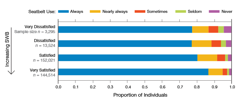 Happier individuals will be more willing to engage in activities that reduce risk. Seatbelt use and not being involved in a car accident were both more likely among those with higher subjective well-being. In a representative sample of 313,354 US households, the authors estimated that individuals who reported being “very satisfied” were 5.3% more likely to always wear a seatbelt.