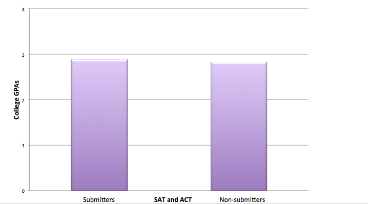 A study found that there is no significant difference between the college GPAs of students who submit standardized tests scores and students who do not. The GPAs of submitters were only .05 points higher than that of non-submitters. The difference in their graduation rates was only .6%, a very insignificant difference.