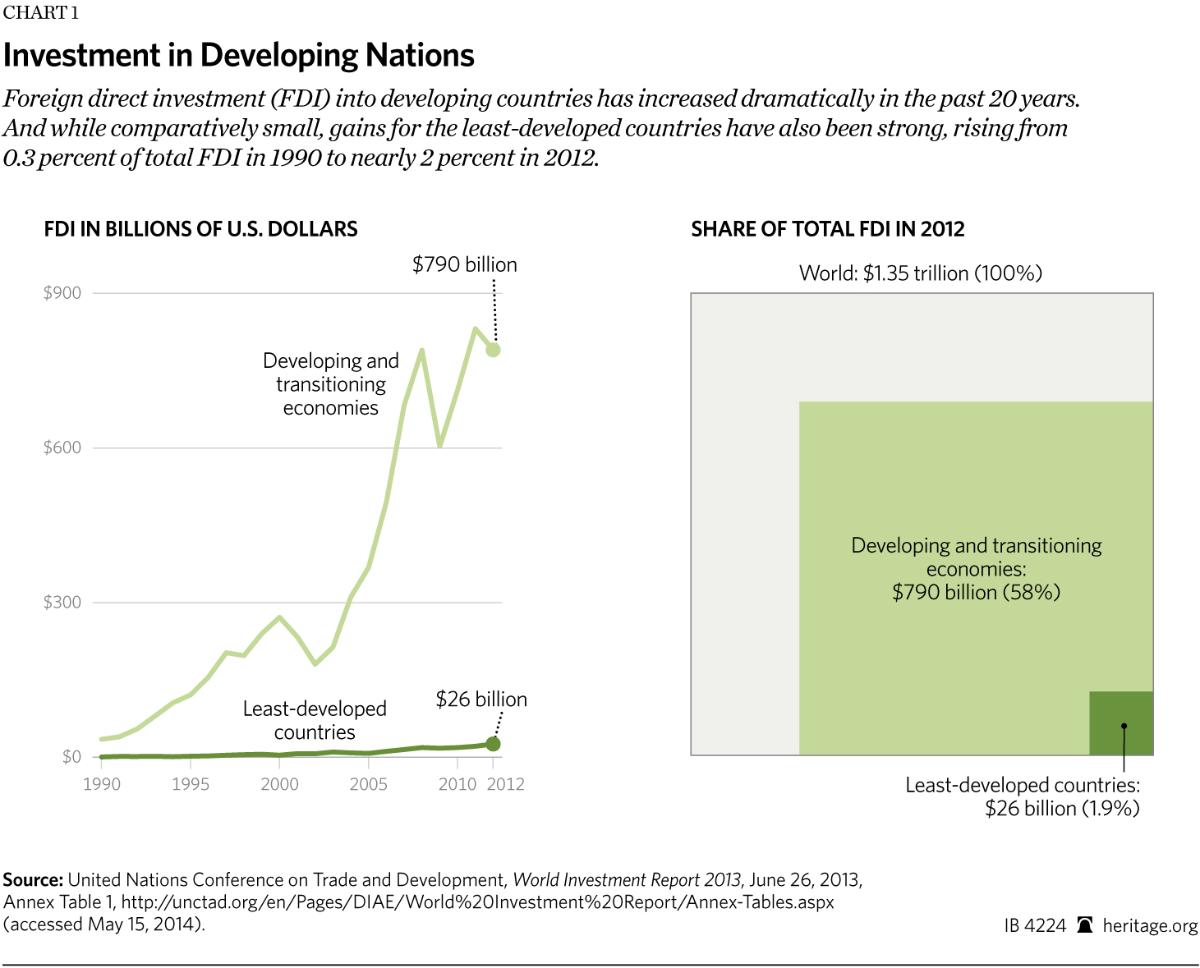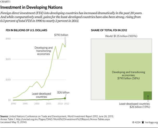Foreign direct investment (FDI) into developing countries has increased dramatically in the past 20 years. And while comparatively small, gains for the least-developed countries have also been strong, rising from 0.3 percent of total FDI in 1990 to nearly 2 percent in 2012.