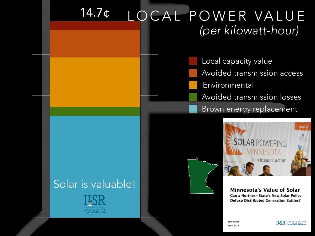 The basic concept behind value of solar is that utilities should pay a transparent and market-based price for solar energy, rather than the retail electricity rate. This chart shows Minnesota's rough calculation of the value of solar, which includes avoiding the purchase of energy from other polluting or "brown" energy sources. Learn more about Minnesota's "value of solar" policy: bit.ly/RvwmCk