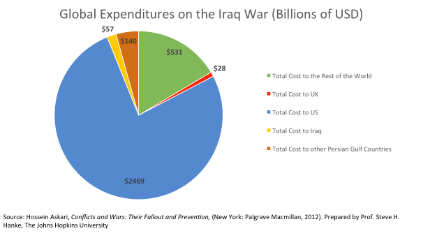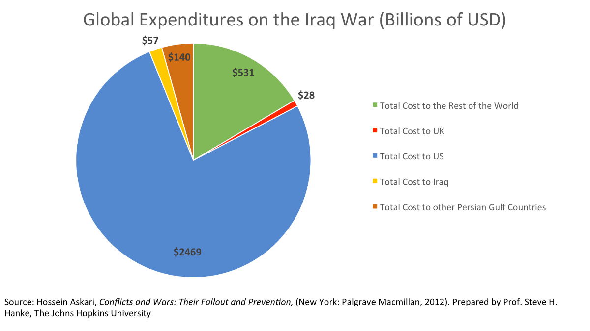 The U.S. shouldered a heavy load in the Iraq War, to the tune of $2.4 trillion from 2003-2011. As depicted in this chart, the $2.4 trillion U.S. tab accounted for over 75% of global expenditures in the Iraq War.