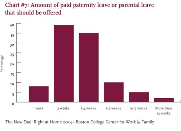 The Boston College Center for Work & Family surveyed over 1,000 fathers about their experiences with and attitudes about paternity leave. Fully 99% percent of the mainly white-collar professional fathers believe that their organizations should offer paid paternity leave (chart indicates preferred duration of paid leave). Read more in The New Dad: Take Your Leave.