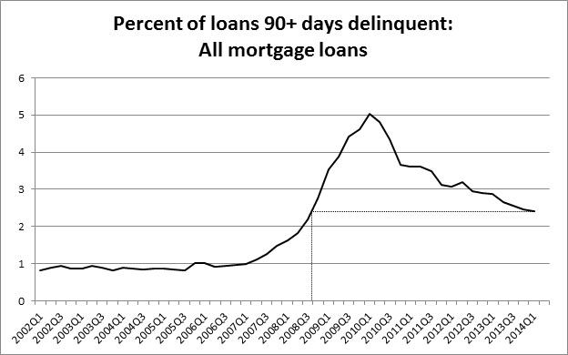 For all mortgage loans, the rate of 90+ day delinquencies has fallen by more than half, from 5.02% at the peak to 2.41% in Q1 of 2014. That is progress, but this takes us back only as far as the 2008 level. The current rate is still 2.7 times as high as the 2002 average delinquency rate, which was 0.89%.