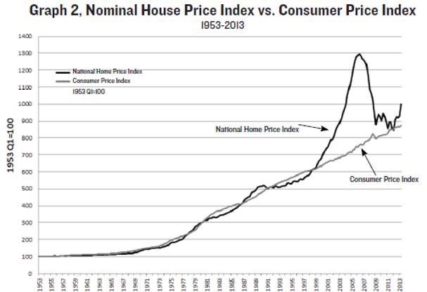 This chart compares the growth in the consumer price index to estimated national average house prices, with the egregious housing bubble of last decade obvious. With home prices now on the upswing, we're not yet in another housing bubble, but politicians should not make moves to promote further house price inflation.