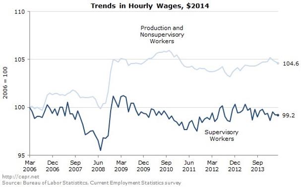 Average hourly earnings of production and non-supervisory workers has risen at a 2.3% rate over the last year, compared to an increase of 2.0% for all workers. This continues a pattern in wage growth that we have seen throughout the recovery with wages of production workers rising more rapidly than wages of supervisory workers, who tend to be better educated.